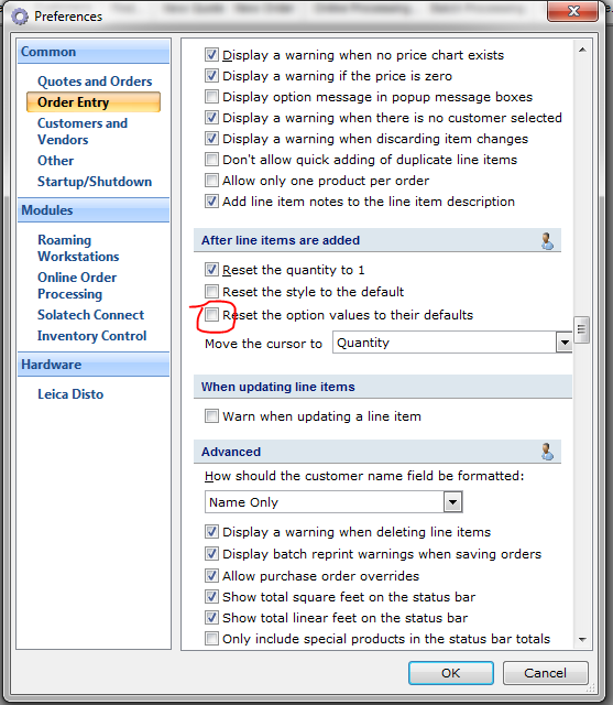 This article explains how to set Preferences in Solatech to retain all options after a line item is added.