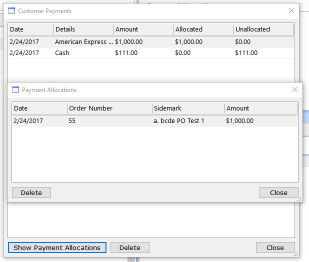 "Allocated" payments have been assigned to a sale or order. An "unallocated" payment is one that has been recorded for the customer, but has not been assigned to a Sale or Order. A credit balance occurs when one or more payments have "unallocated" amounts.
