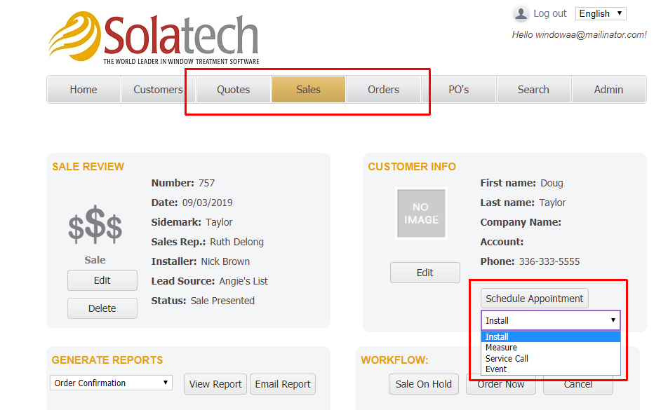 - From within a Quote, Sale or Order. Note that scheduling from within a Quote, Sale or Order will allow you to select from multiple types of appointments using a drop down menu.