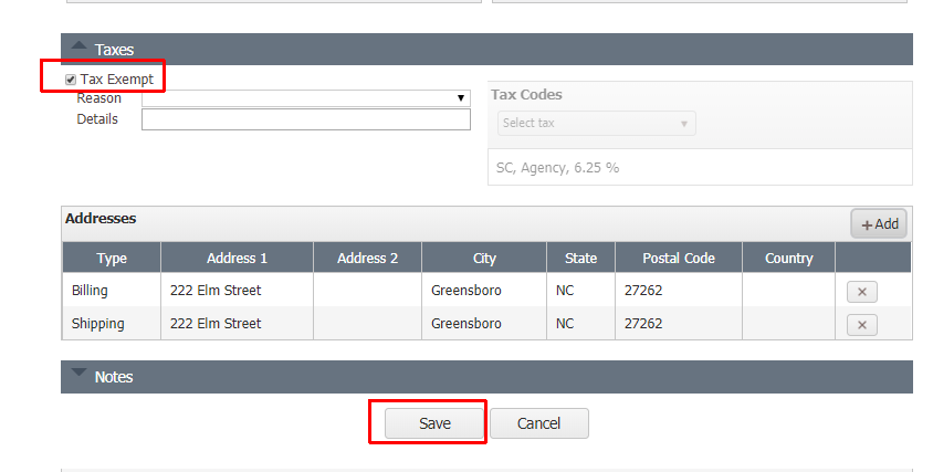 - If sales tax should apply to the customer in the future, remove the checkmark to the left of tax-exempt, then continue adding sales tax as normal. Save the record once changes have been completed.